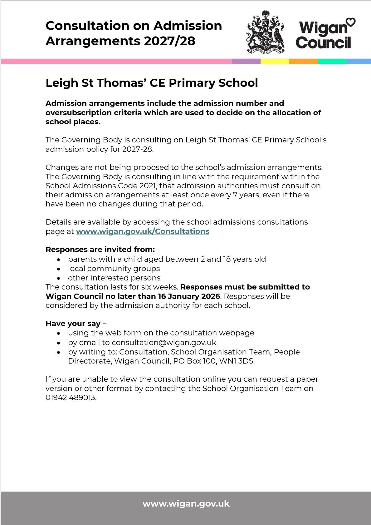 We are consulting on our admission arrangements for families wishing to apply for Reception in 2027-2028. Please find details below: -